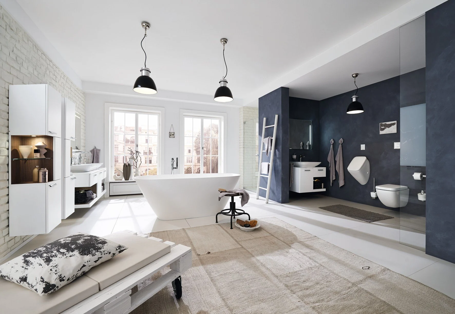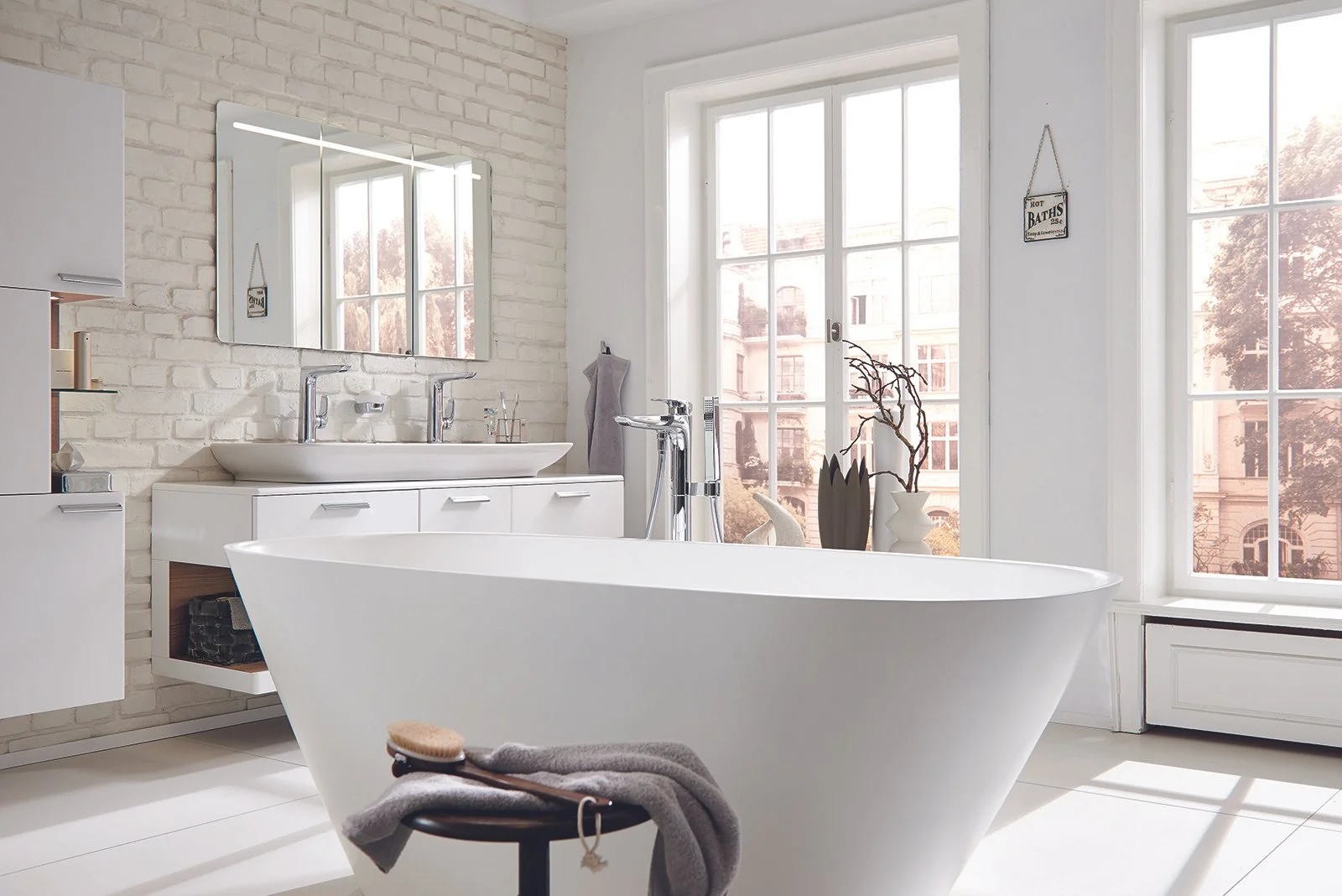 Die freistehende Wanne: klarer Blick, minimalistische Umgebung — Ruhe und Komfort ganz bewusst gesetzt.